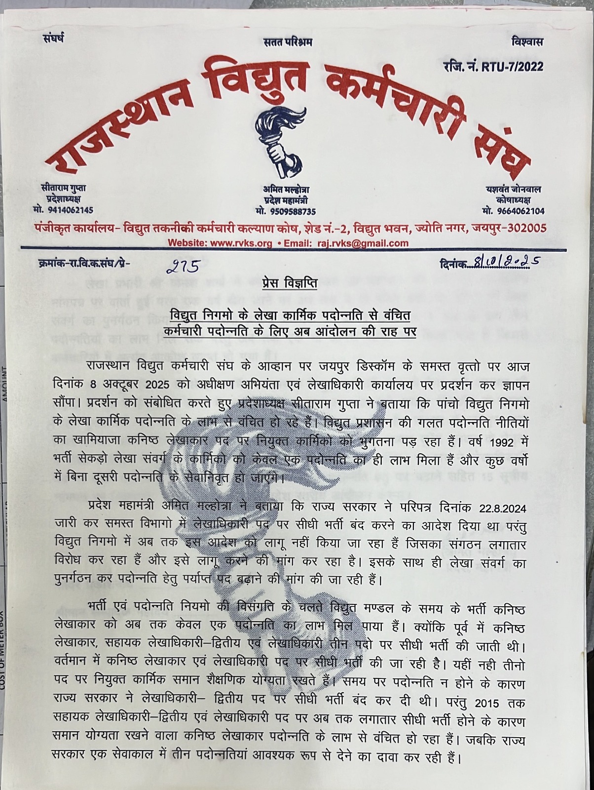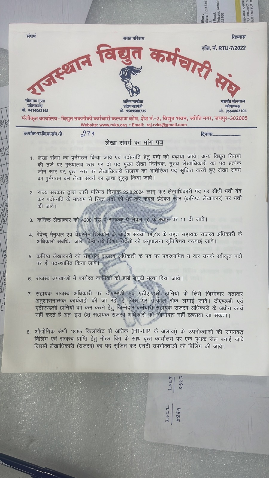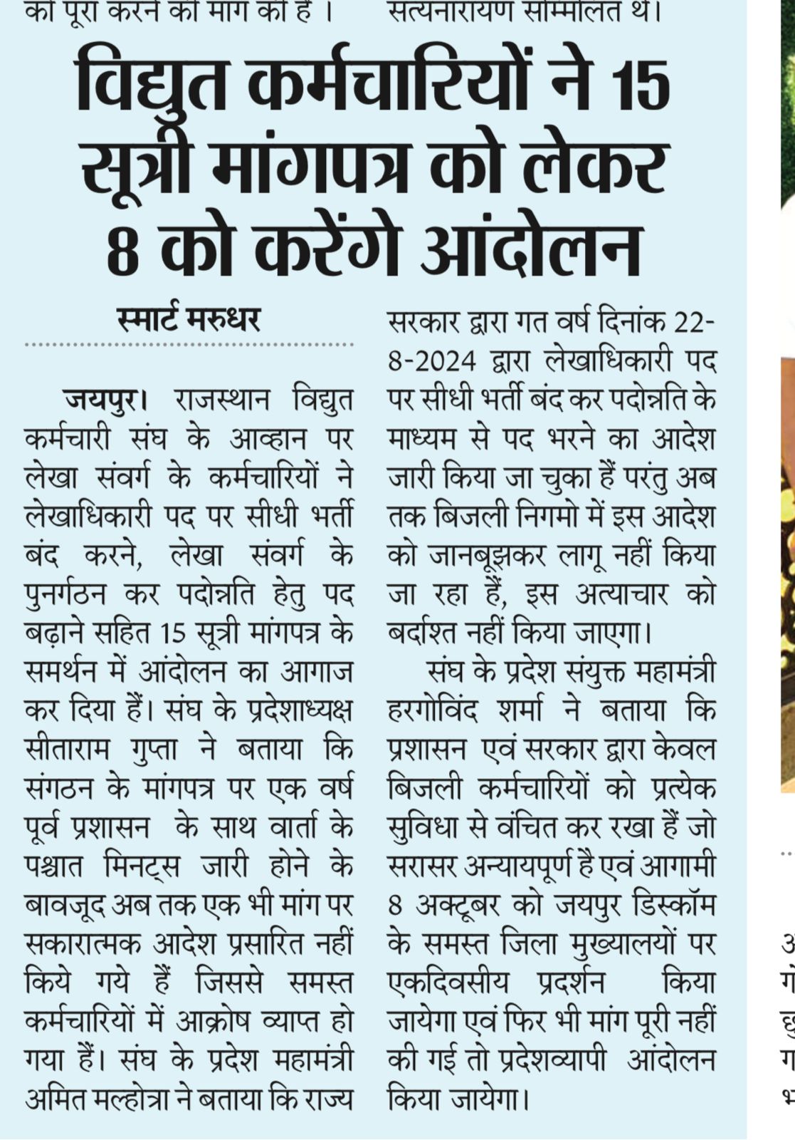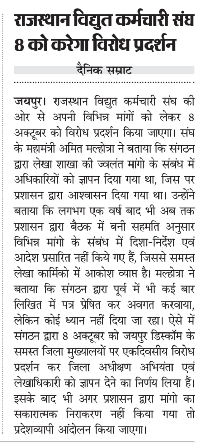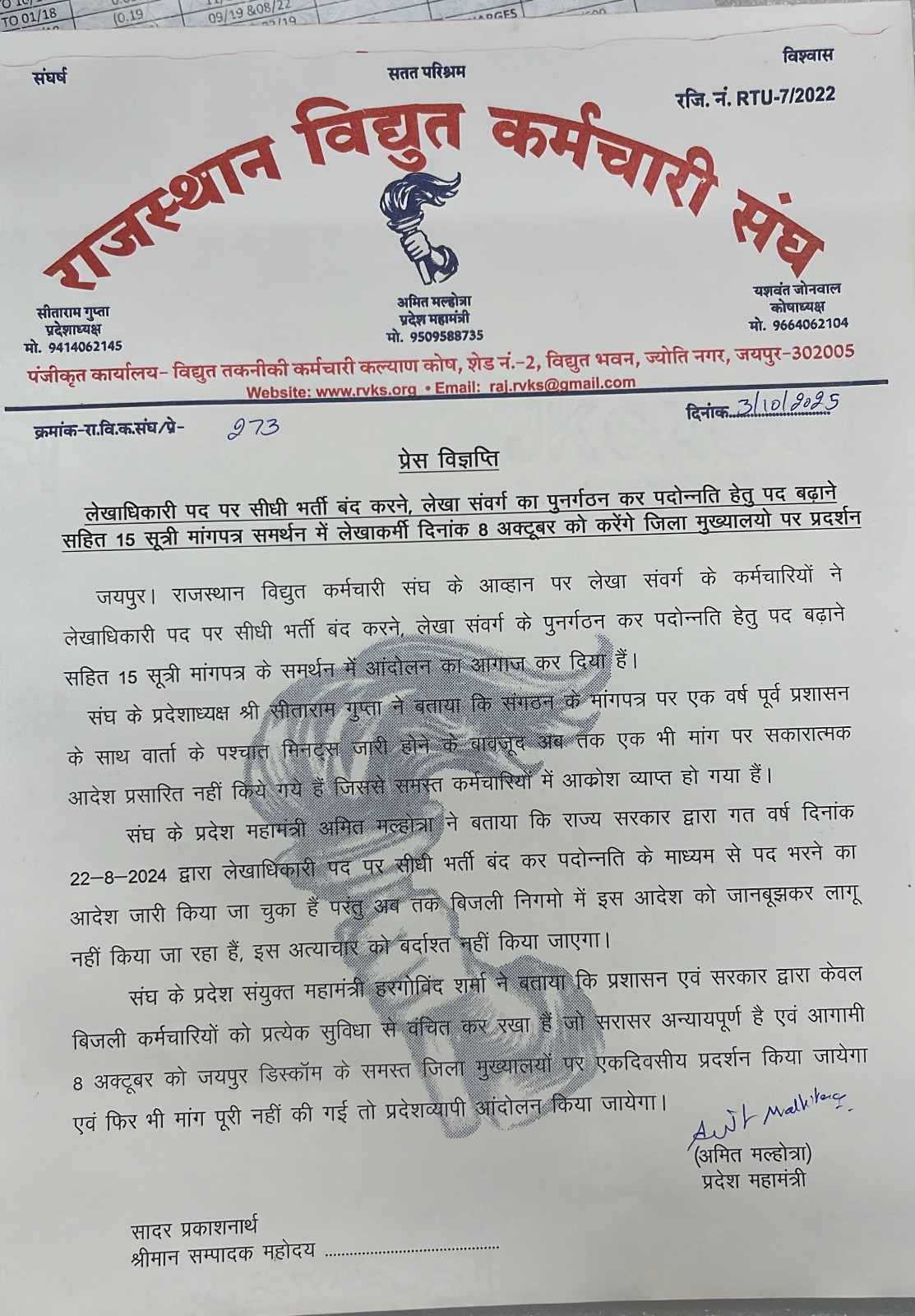 राजस्थान विद्युत कर्मचारी संघ के आव्हान पर लेखा संवर्ग की 15 सूत्रीय मांगपत्र के निराकरण हेतु 8 अक्टूबर 2025 को जिला मुख्यालयों पर प्रदर्शन की झलकियॉ