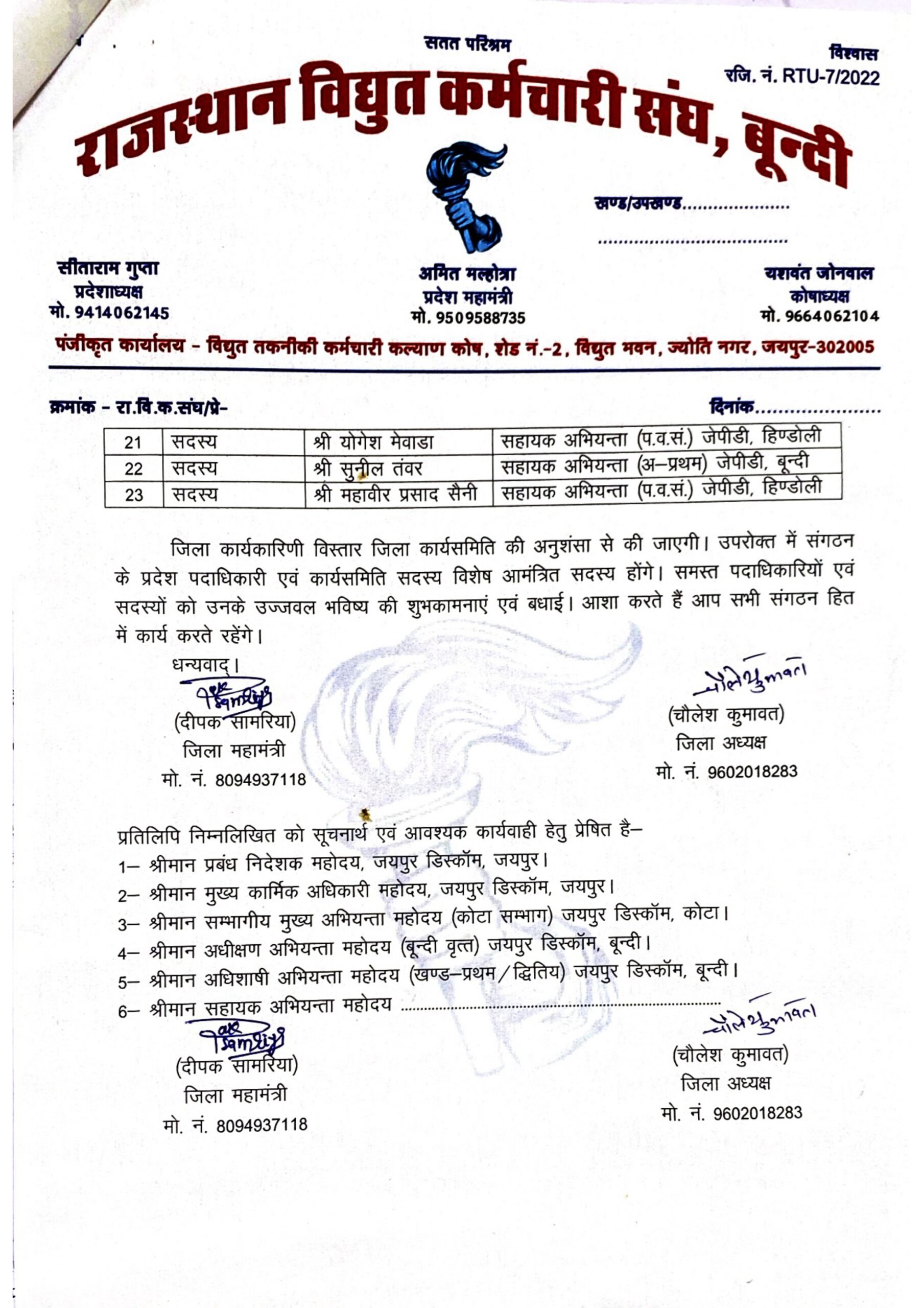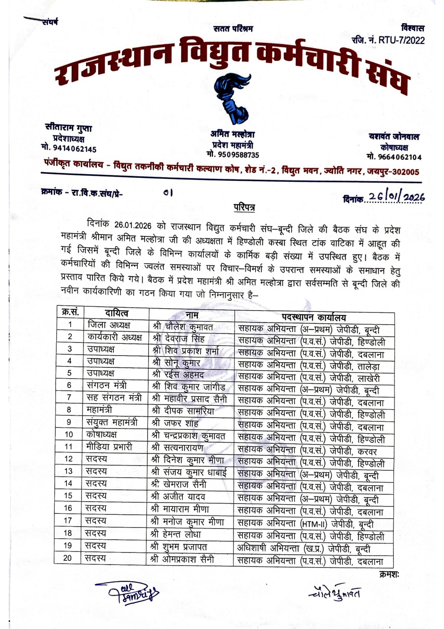 दिनांक 26.01.2026 को राजस्थान विद्युत कर्मचारी संघ – बूंदी जिले की बैठक एवं नवीन कार्यकारिणी का गठन