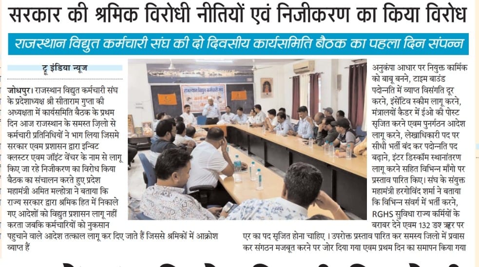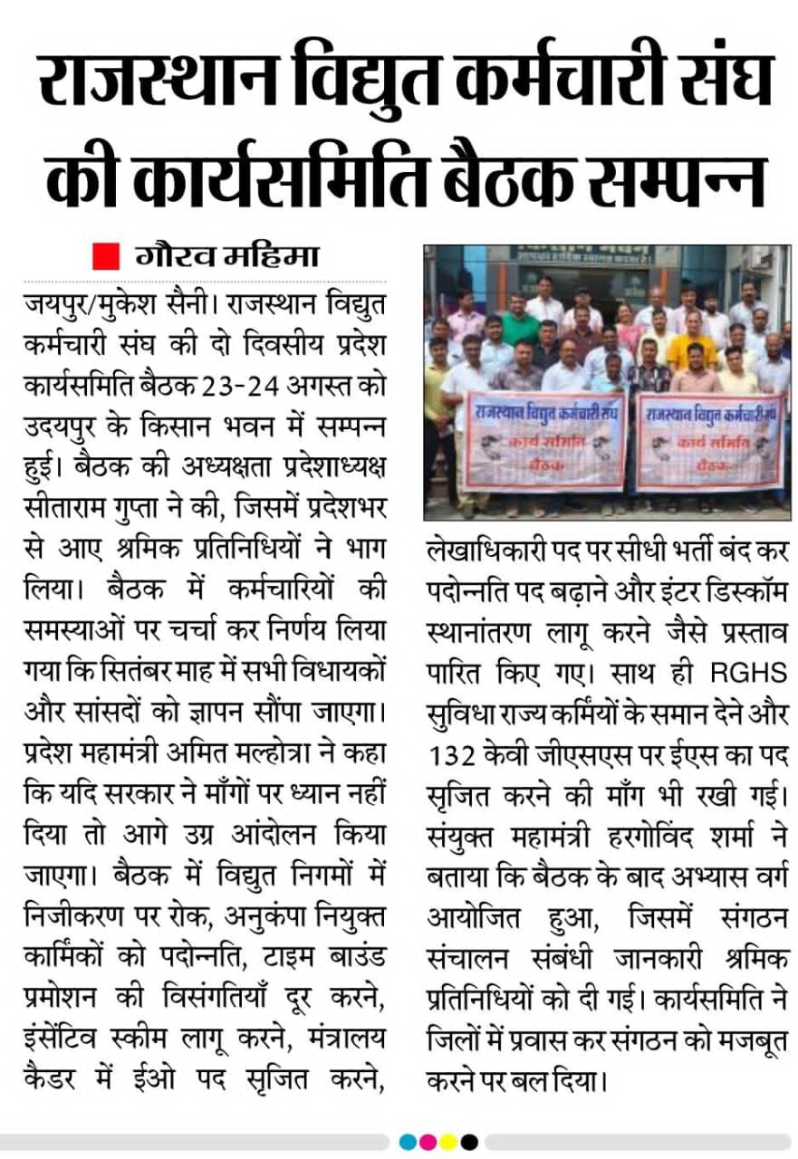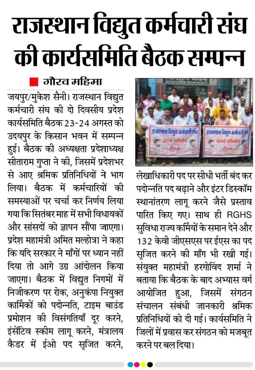 राजस्थान विद्युत कर्मचारी संघ की चतुर्थ कार्यसमिति बैठक उदयपुर में दिनांक 23 एवं 24 अगस्त 2025 को संपन्न